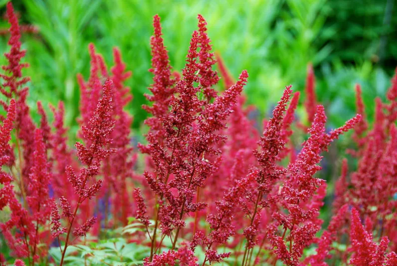 Žiedai: tankios, siauros šluotelės (žiedynai) – sodriai tamsiai raudonos, vienos iš tamsiausių tarp astilbių.